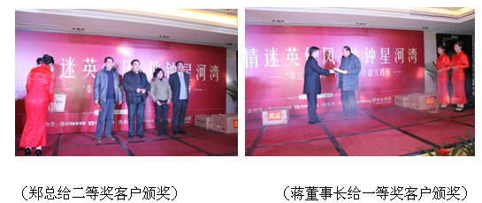 為回饋廣大準(zhǔn)業(yè)主對(duì)泰達(dá)星河灣的厚愛(ài),這次活動(dòng)主辦方特別安排了抽獎(jiǎng)環(huán)節(jié),分別設(shè)有一、二、三等獎(jiǎng),其中一等獎(jiǎng)1名,獎(jiǎng)品為IPAD2平板電腦,二、三等獎(jiǎng)獎(jiǎng)品豐厚,抽獎(jiǎng)也將現(xiàn)場(chǎng)的氣氛再一次帶到高潮。 最后在頒獎(jiǎng)中,本次活動(dòng)圓滿(mǎn)結(jié)束