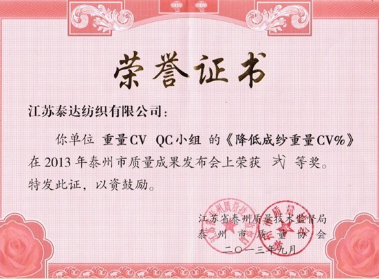 同時(shí),公司QC小組攜此課題參加了2013年“泰州移動(dòng)杯”QC小組質(zhì)量成果大賽并最終入選。2013年9月26日,泰州市質(zhì)量技術(shù)監(jiān)督局特邀有關(guān)領(lǐng)導(dǎo)和專家擔(dān)任評委,對各企業(yè)入選成果進(jìn)行評審。最終,我公司“降低成紗重量CV%”QC小組榮獲二等獎(jiǎng),這是姜堰區(qū)入選企業(yè)榮獲的最高名次,亦是泰州全市、區(qū)范圍內(nèi)紡織企業(yè)獲獎(jiǎng)的最高名次。