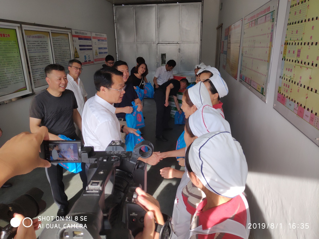 2019年建軍節(jié)下午,姜堰區(qū)區(qū)長冒著酷暑蒞臨江蘇泰達(dá)控股集團(tuán)公司一分廠生產(chǎn)現(xiàn)場,為職工送清涼,慰問一線職工。