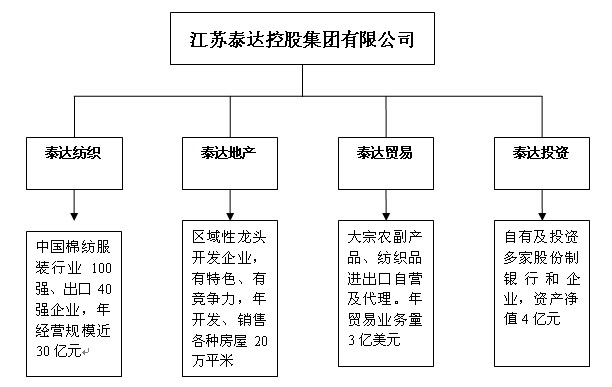 江蘇泰達控股集團有限公司是集紡織、房地產(chǎn)、進出口貿(mào)易、股權(quán)投資等多個行業(yè)為一體的私營綜合企業(yè)集團。多年來,公司堅持“以人為本,科學(xué)管理,不斷創(chuàng)新”的經(jīng)營理念,在業(yè)內(nèi)享有較高的聲譽。